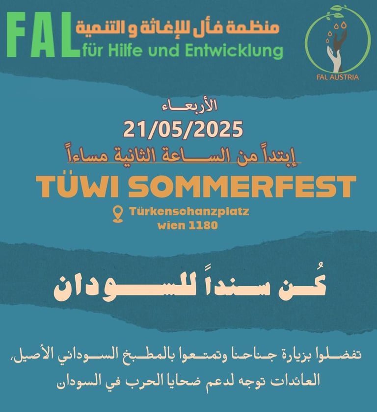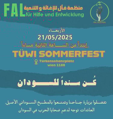 تدعوكم منظمة FAL Austria لحضور مهرجان الصيف TÜWI يوم الأربعاء 21 مايو 2025 ابتداءً من الساعة 14:00 في حديقة Türkenschanzplatz، فيينا 1180.
