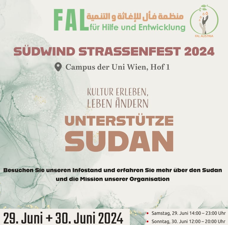 في مايو 2024، تشرفت فأل بالمشاركة في فعالية محلية في فيينا بالتعاون مع عدد من المنظمات المحلية. يسعدنا أن نعلن أن جميع أرباح مبيعاتنا من الفعالية قد تم تخصيصها لدعم العائلات السودانية المتضررة من الحروب الدائرة. إن التزامنا بالمجتمع والتضامن هو في صميم عملنا، ونحن ممتنون لهذه الفرصة لإحداث تأثير إيجابي. معًا، يمكننا أن نستمر في مد يد العون لمن هم في حاجة.