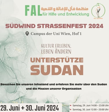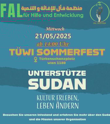 Im Mai 2024 hatte Faal die Ehre, an einer lokalen Veranstaltung in Wien teilzunehmen, in Zusammenarbeit mit verschiedenen lokalen Organisationen. Wir freuen uns, bekannt zu geben, dass unser gesamter Verkaufserlös aus der Veranstaltung dazu verwendet wurde, sudanesische Familien zu unterstützen, die von den anhaltenden Konflikten betroffen sind. Unser Engagement für Gemeinschaft und Solidarität steht im Mittelpunkt unserer Arbeit, und wir sind dankbar für die Möglichkeit, einen sinnvollen Beitrag zu leisten. Gemeinsam können wir weiterhin denen helfen, die in Not sind.