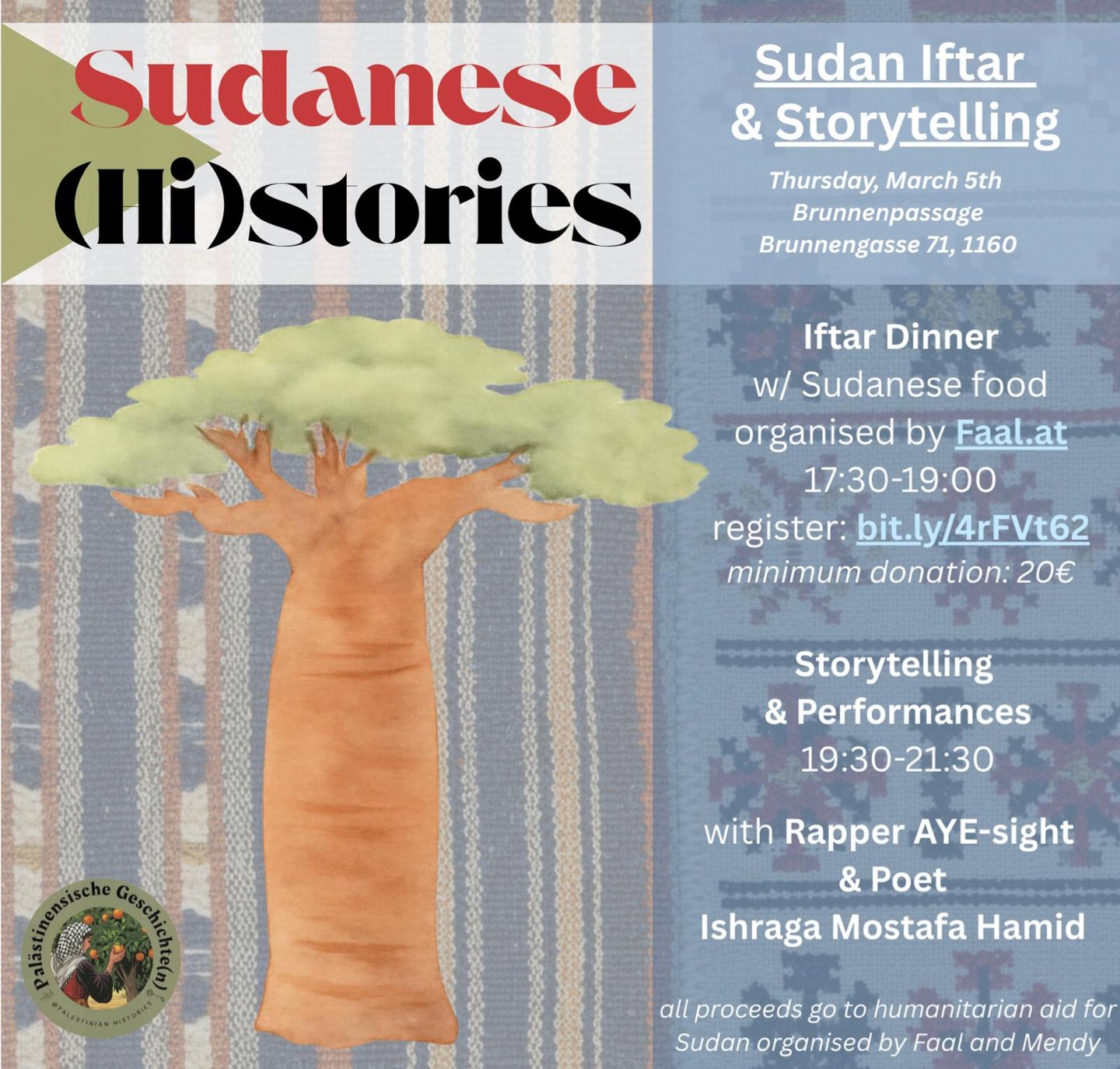 تدعوكم Palestinian Histories إلى إفطار (عشاء سوداني) يتبعه حكايات وعروض. للتسجيل: bit.ly/4rFVt62 • 5/3/2026 • الإفطار 17:30 • البرنامج 19:30 • Brunnenpassage (1160)