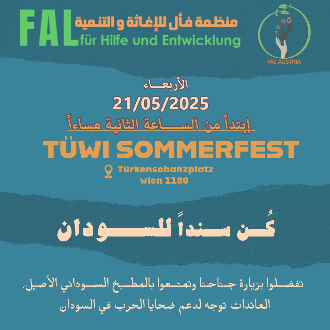 تدعوكم منظمة FAL Austria لحضور مهرجان الصيف TÜWI يوم الأربعاء 21 مايو 2025 ابتداءً من الساعة 14:00 في حديقة Türkenschanzplatz، فيينا 1180.