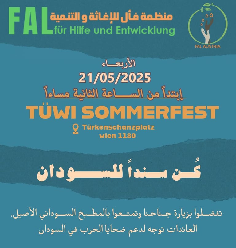 في مايو 2024، تشرفت فأل بالمشاركة في فعالية محلية في فيينا بالتعاون مع عدد من المنظمات المحلية. يسعدنا أن نعلن أن جميع أرباح مبيعاتنا من الفعالية قد تم تخصيصها لدعم العائلات السودانية المتضررة من الحروب الدائرة. إن التزامنا بالمجتمع والتضامن هو في صميم عملنا، ونحن ممتنون لهذه الفرصة لإحداث تأثير إيجابي. معًا، يمكننا أن نستمر في مد يد العون لمن هم في حاجة.